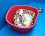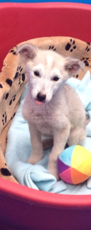 Ahora se encuentra en acogida esperando un adoptante. Tiene dos meses de edad, mucho apetito y muchas ganas de jugar.