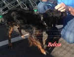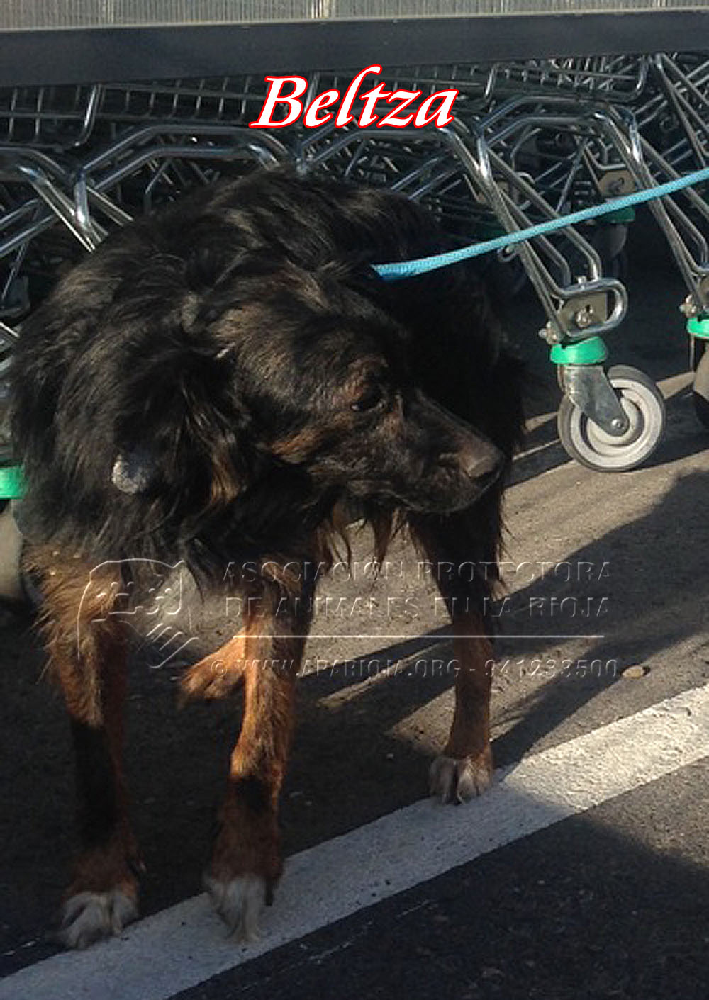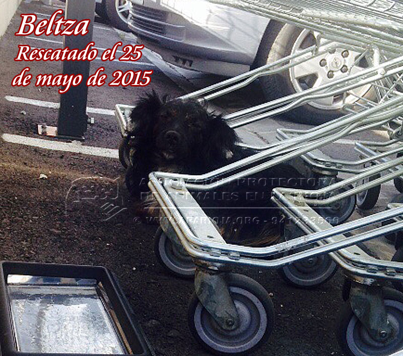 El 25 de mayo de 2015 recibimos la llamada de un centro comercial de Alfaro diciéndonos que había un perro abandonado entre los carros y no se atrevían a cogerlo. Inmediatamente, pese a la distancia que nos separa de allí, dos de nuestros voluntarios se trasladaron allí. Estaba escondido entre los carros, muerto de miedo. No sabemos lo que le pudo pasar antes de dejarlo allí abandonado.