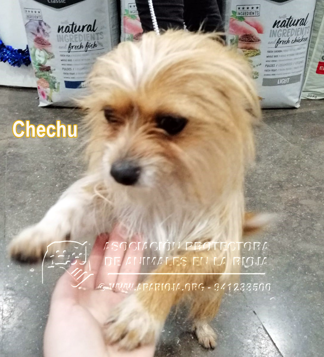De tamaño pequeño y muy cariñoso y sociable tanto con personas como con otros animales, Chechu fue abandonado en un pueblo.