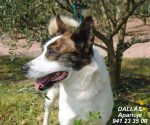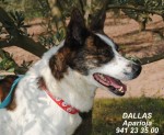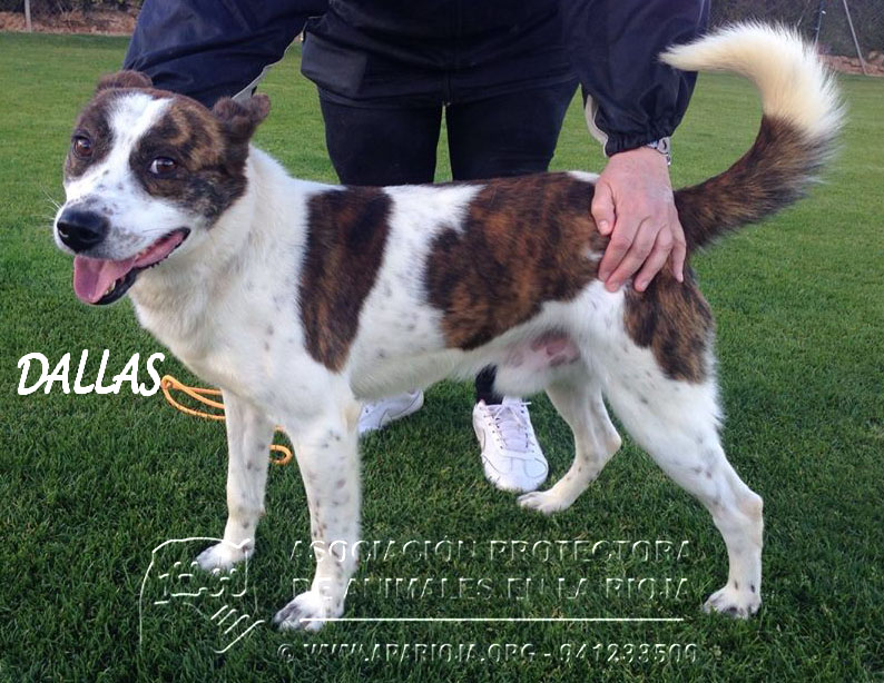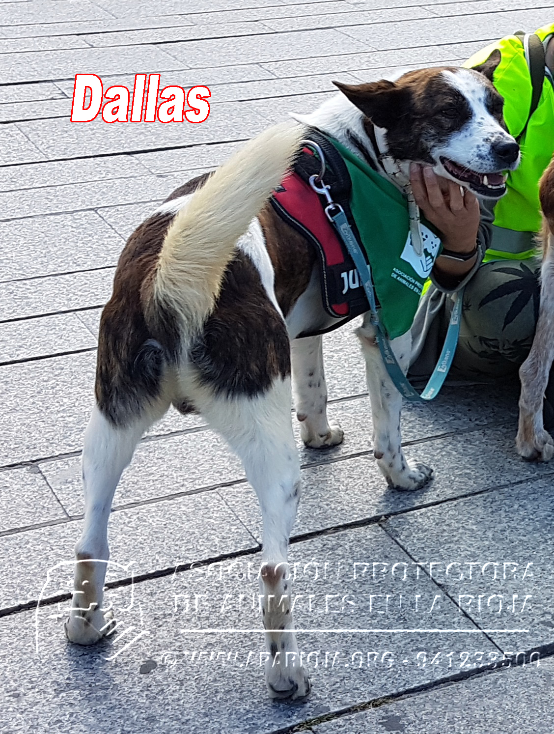 Es un perro mestizo de color blanco y marrón de tamaño mediano, muy bueno y tranquilo, se porta genial, le encanta pasear y que le acaricies. Es fiel, cariñoso y cuando le das una galleta la coge con tanto cuidado q apenas te roza los dedos. Dallas es maravilloso, desde el primer momento se deja,querer