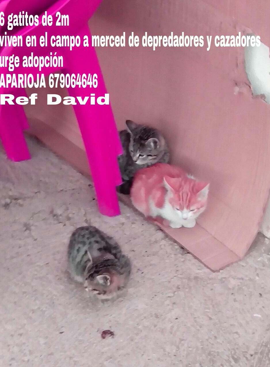 • Observaciones : Son 6 gatitos, aunque solo tenemos foto de estos tres. Nos han enviado así la foto, el color rosa obedece a la poca calidad fotográfica. APARIOJA Teléfono 679064646 PayPal: aparioja@aparioja.org Santander IBAN ES14 0049 6684 17 2516128818 ¿Quieres ayudarnos con 1 euro al mes? Inscríbete en el grupo Teaming. Con un euro al mes nos ayudas a pagar gastos veterinarios, medicamentos, piensos… https://www.teaming.net/protectoradeanimalesenlarioja Sede-tienda solidaria: Doctores Castroviejo 3, Logroño Horario de Lunes a Viernes: de 11 a 14 y de 18 a 21. Sábados de 11 a 14