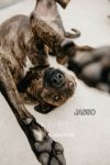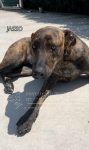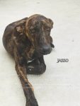 Es un mestizo que se muestra algo tímido con personas al principio, pero es muy bueno y juguetón y con los demás perros es sociable.