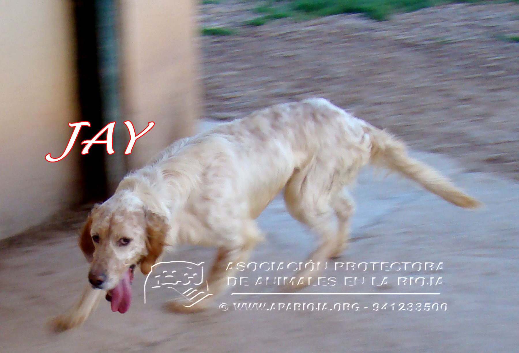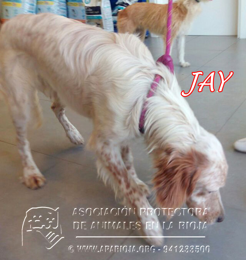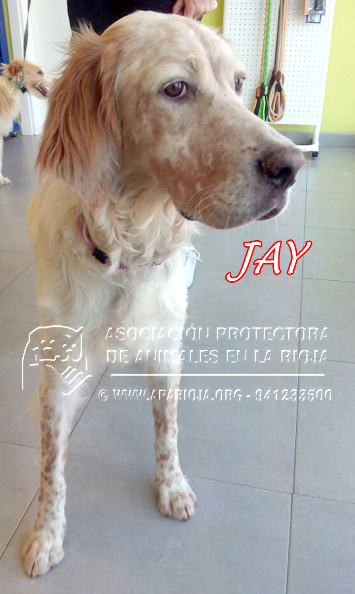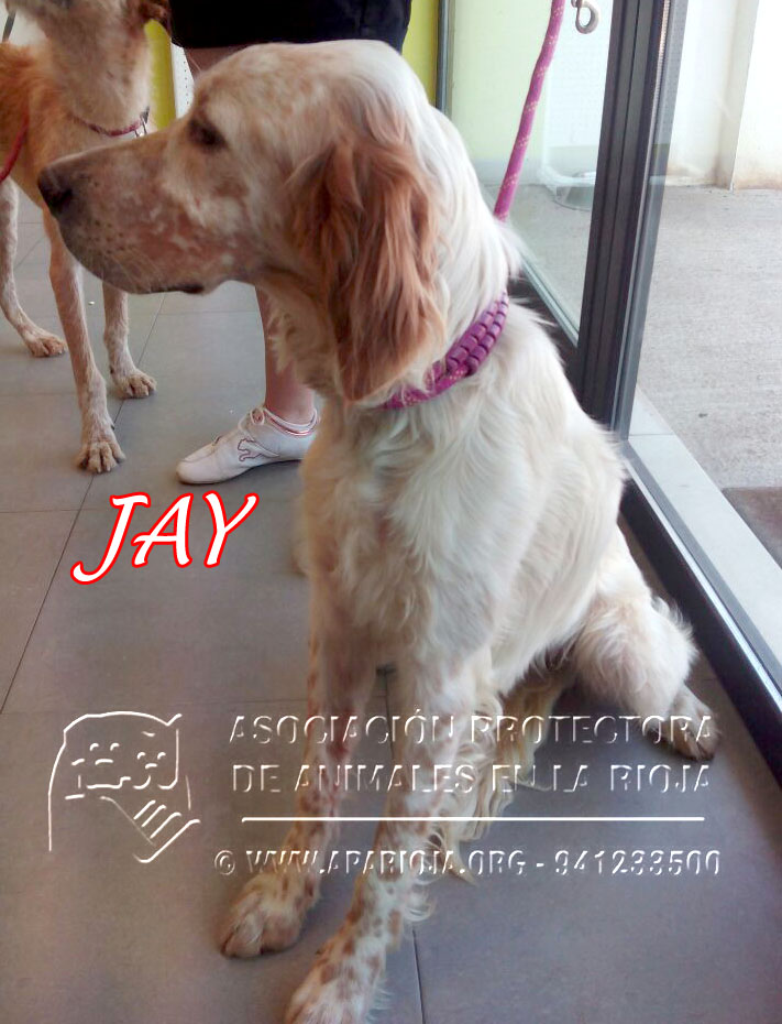 Jay es un perro inquieto, juguetón y muy cariñoso, pero cuando está agusto al calorcito le encanta tumbarse y estar tranquilo.