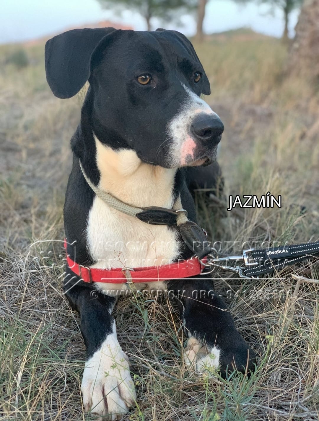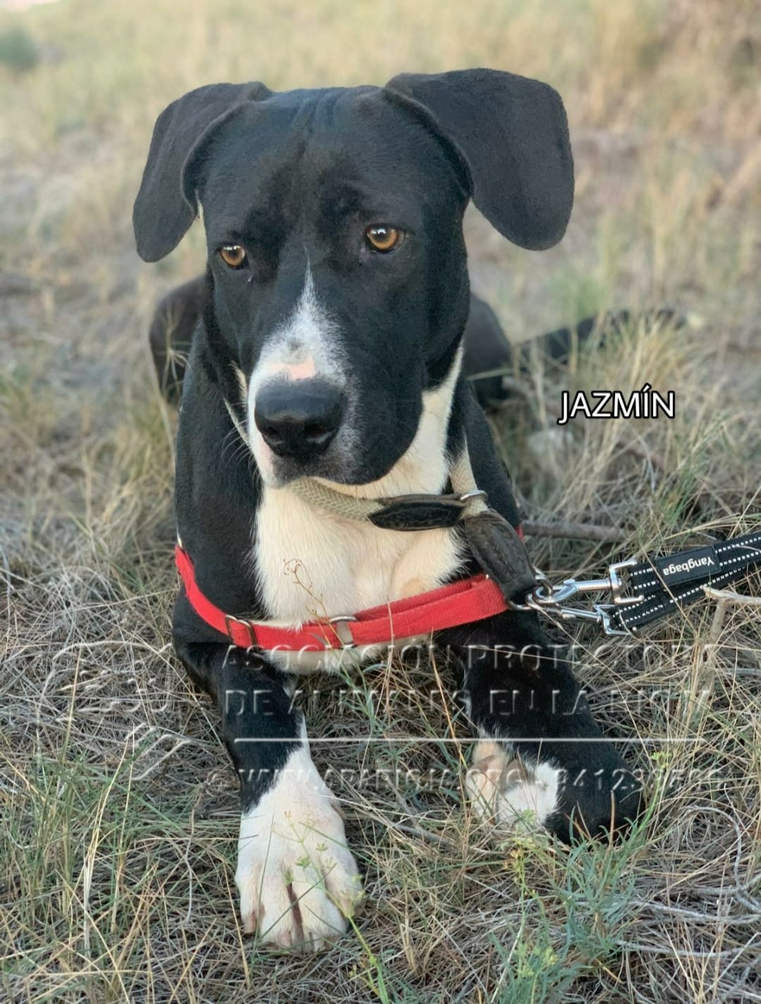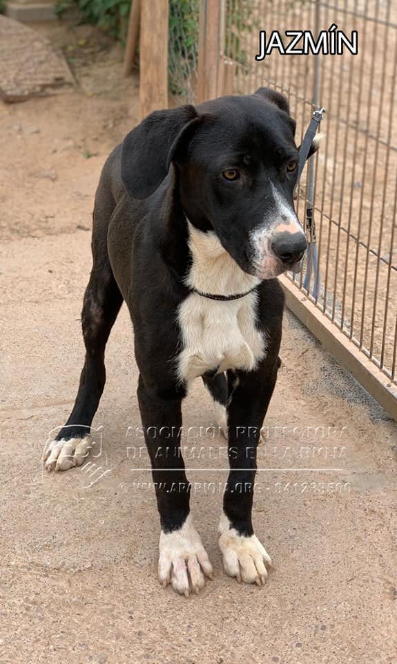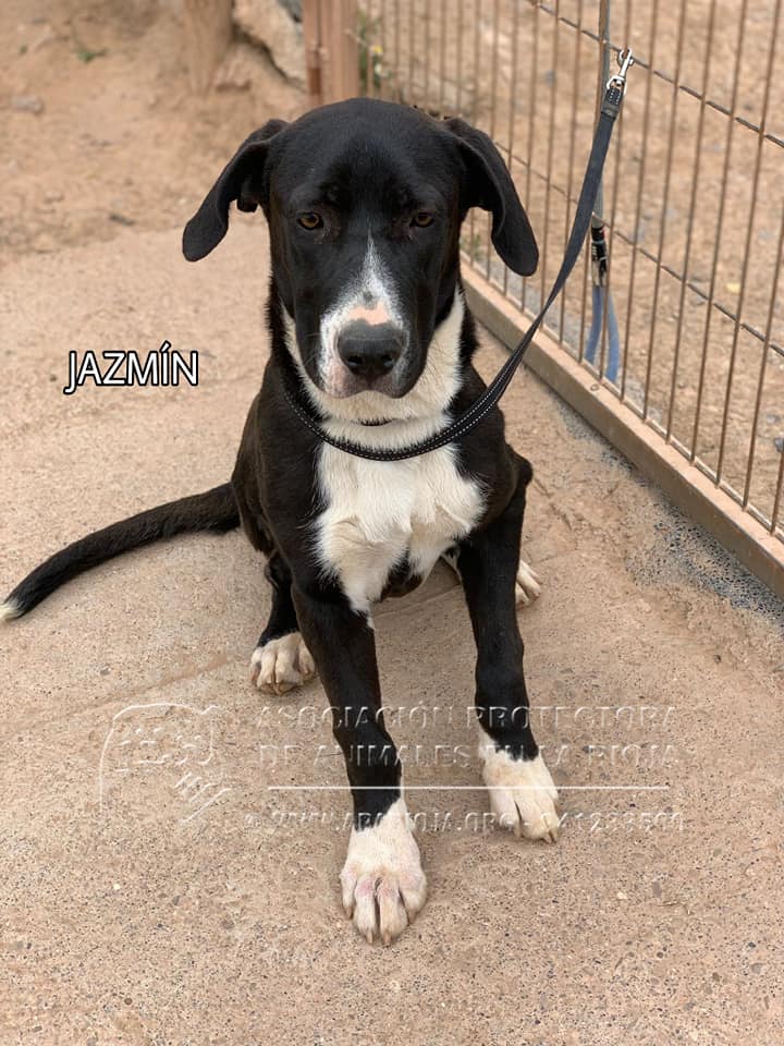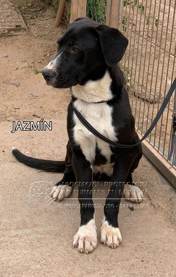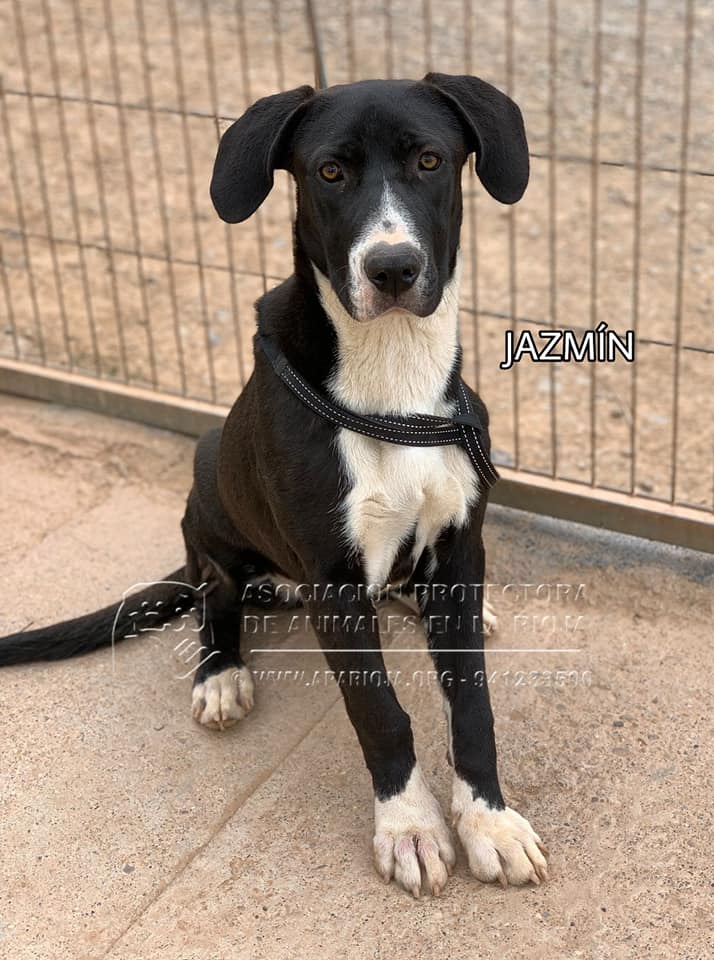 Jazmín es una mestiza juguetona, mimosa, sociable y activa y le encanta el agua. En los paseos va muy bien con correa, es muy graciosa y alegre, siempre que puede coge juguetes, palos o cualquier cosa que le sirva para jugar.