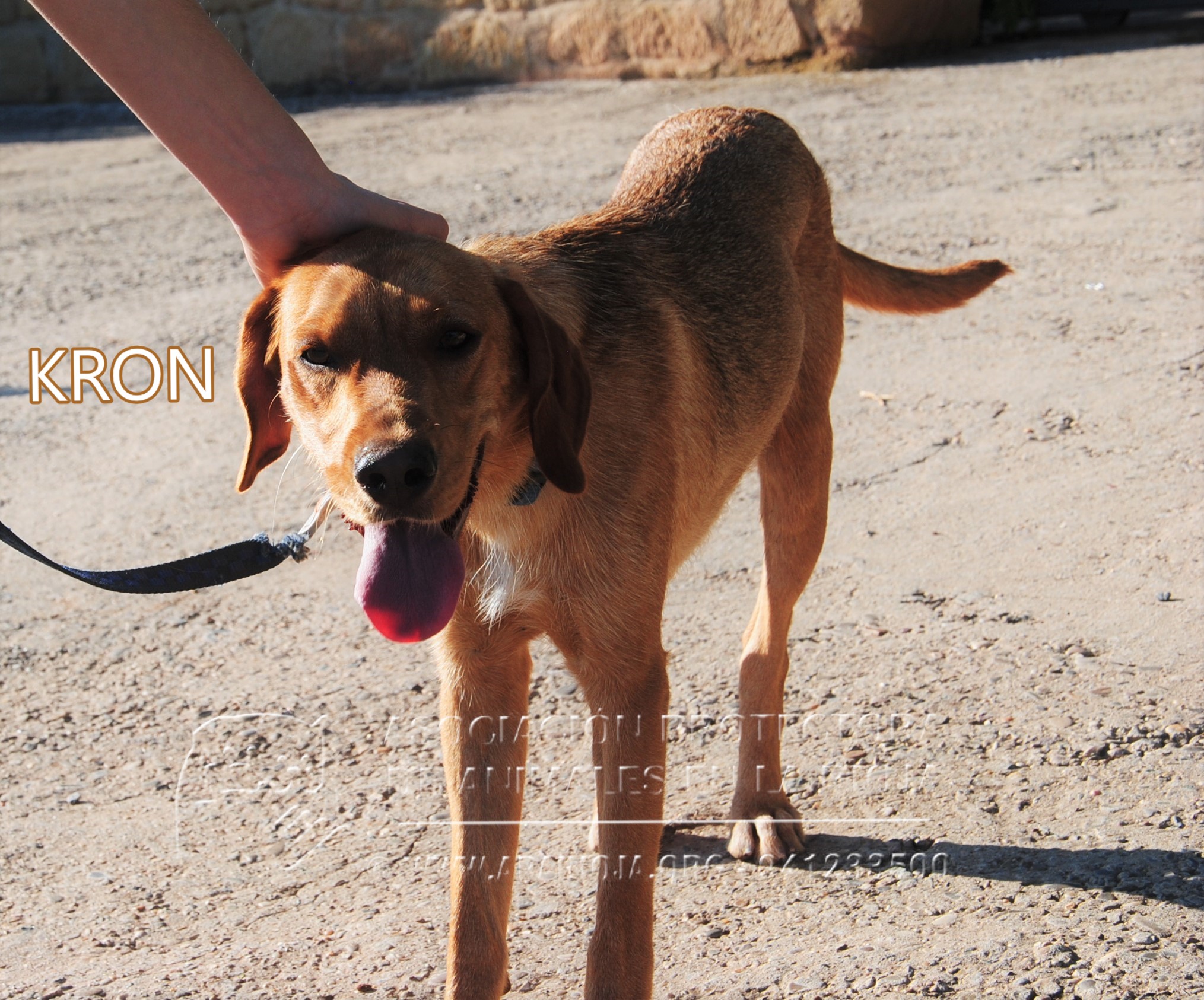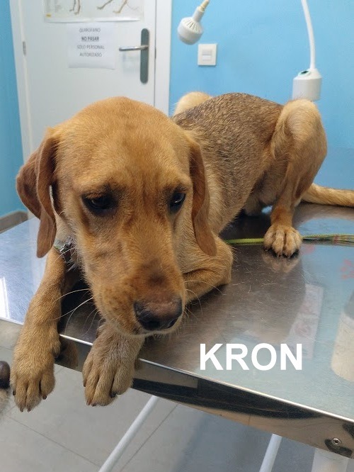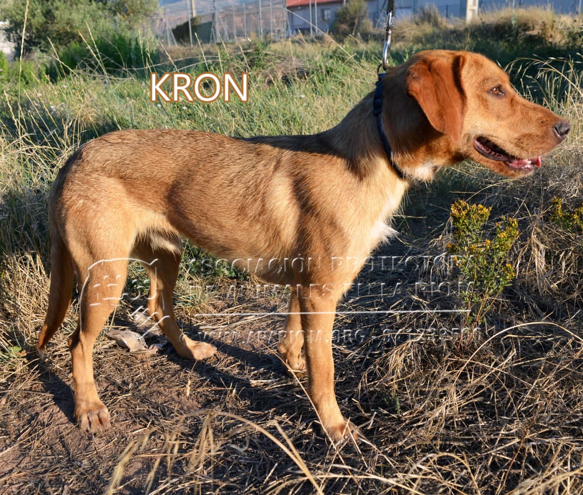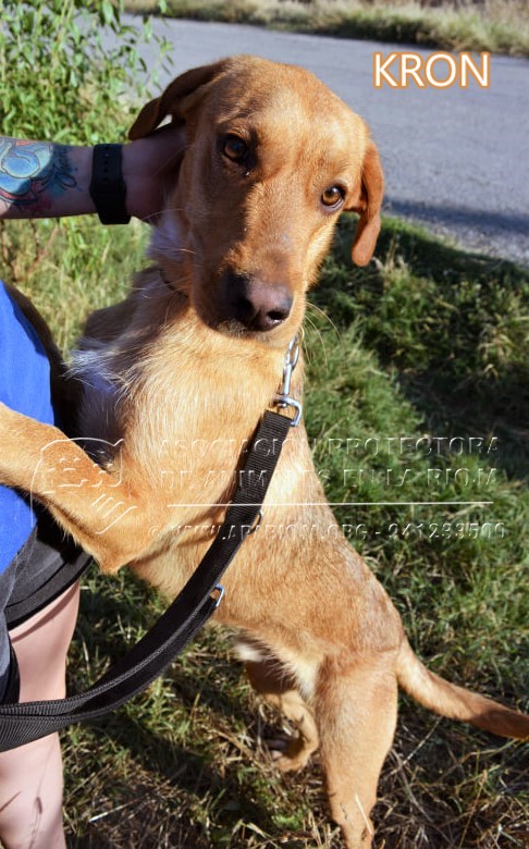 KRON es un podenco, de aproximadamente 14 meses. Es muy simpático y alegre, un «locuelo» que está deseando salir a pasear. Es de tamaño mediano.