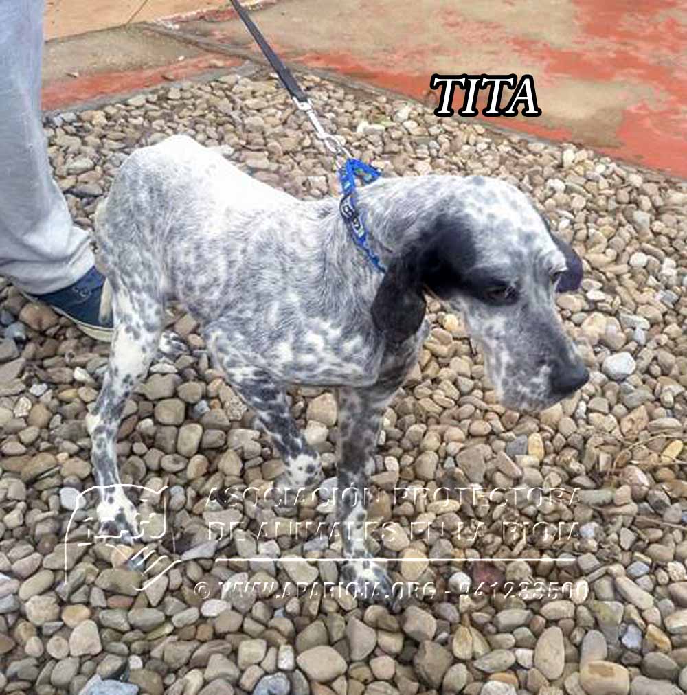 Setter nacida aproximadamente en 2014, buena y tranquila. Recogida vagando en un pueblo y llevada a la perrera. Gracias a que un particular se ofreció a pagar una guardería privada Tita pudo salir de la perrera.
