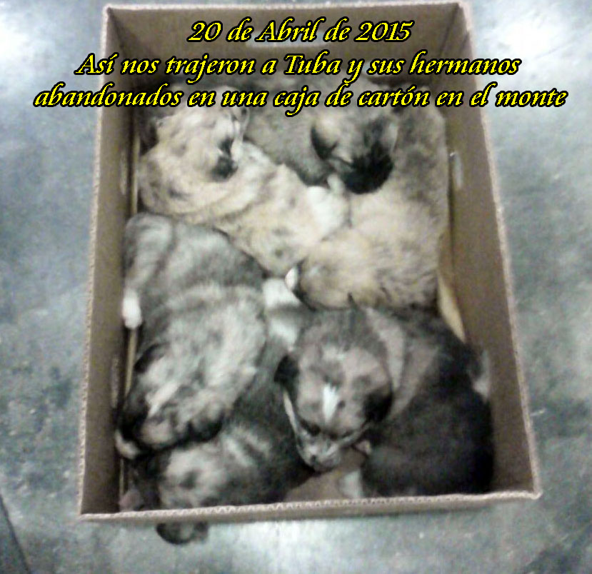 El 20 de Abril de 2015 nos trajeron una caja de cartón con 6 cachorritos de apenas un mes de vida abandonados en el monte. Todos están adoptados salvo TUBA. También estuvo adoptada, pero se cansaron pronto del juguete y la devolvieron.