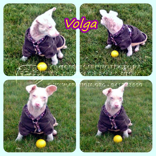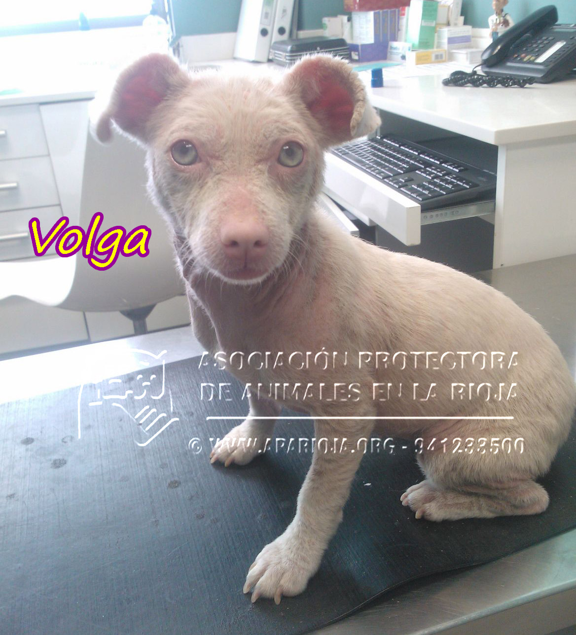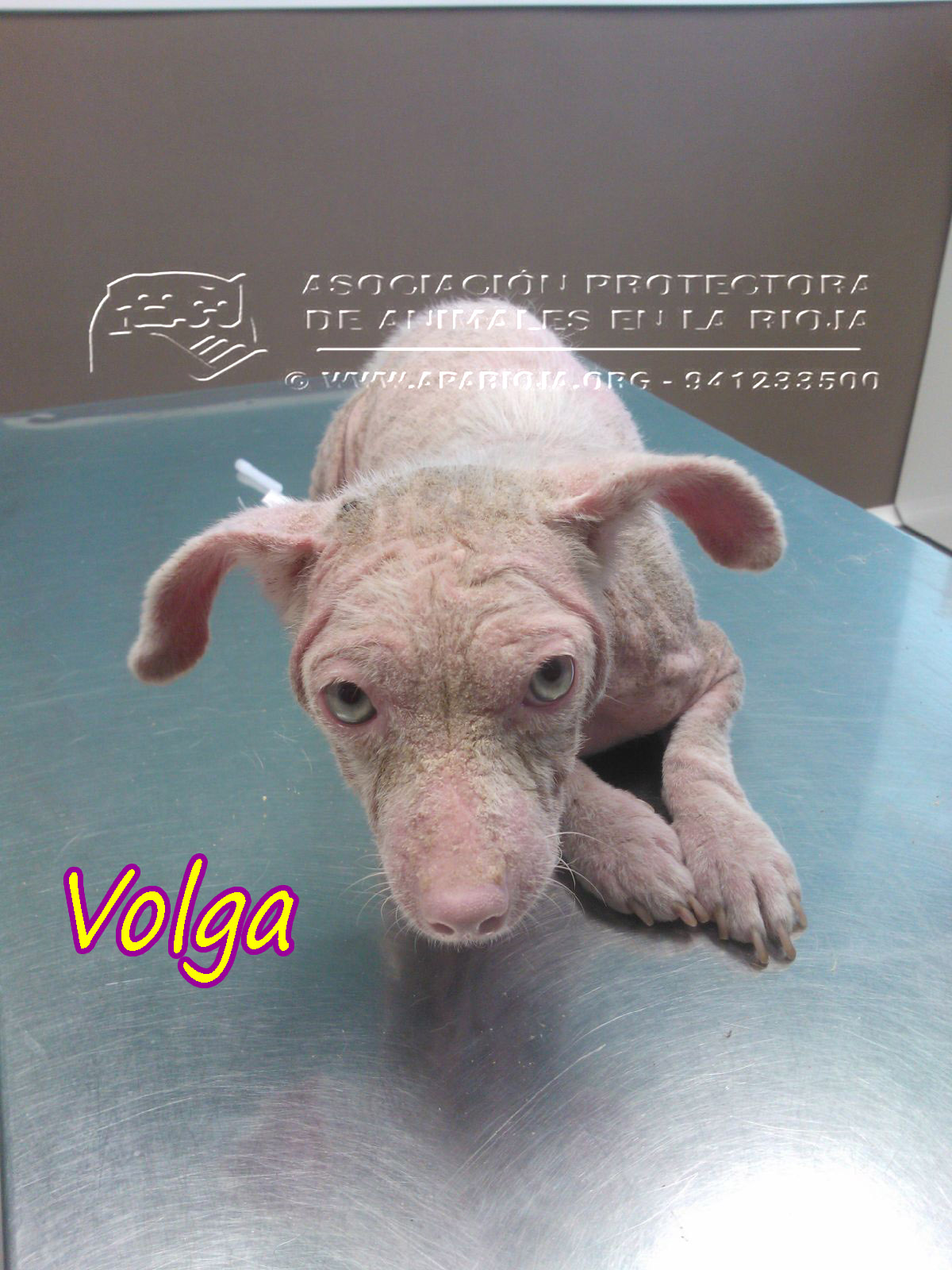 Volga es una de las perritas con sarna recogidas en el monte el Corvo el pasado verano. Su aspecto en esos momentos era impactante, entre otras cosas no tenía pelo y su piel debido a la enfermedad, estaba acartonada.