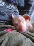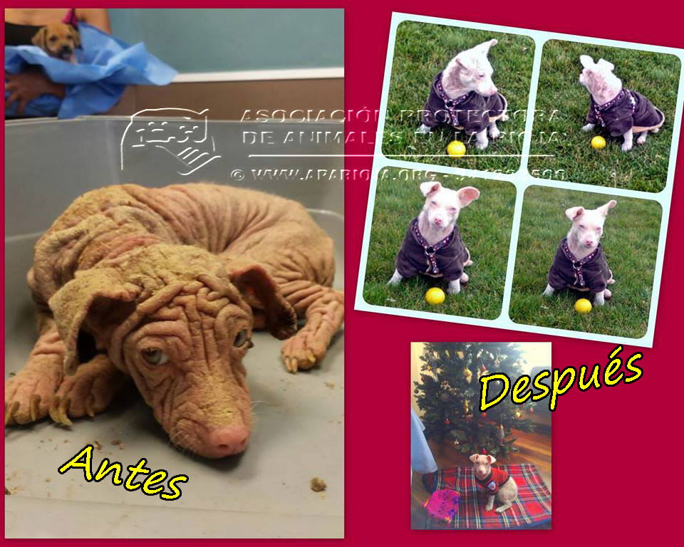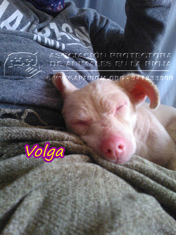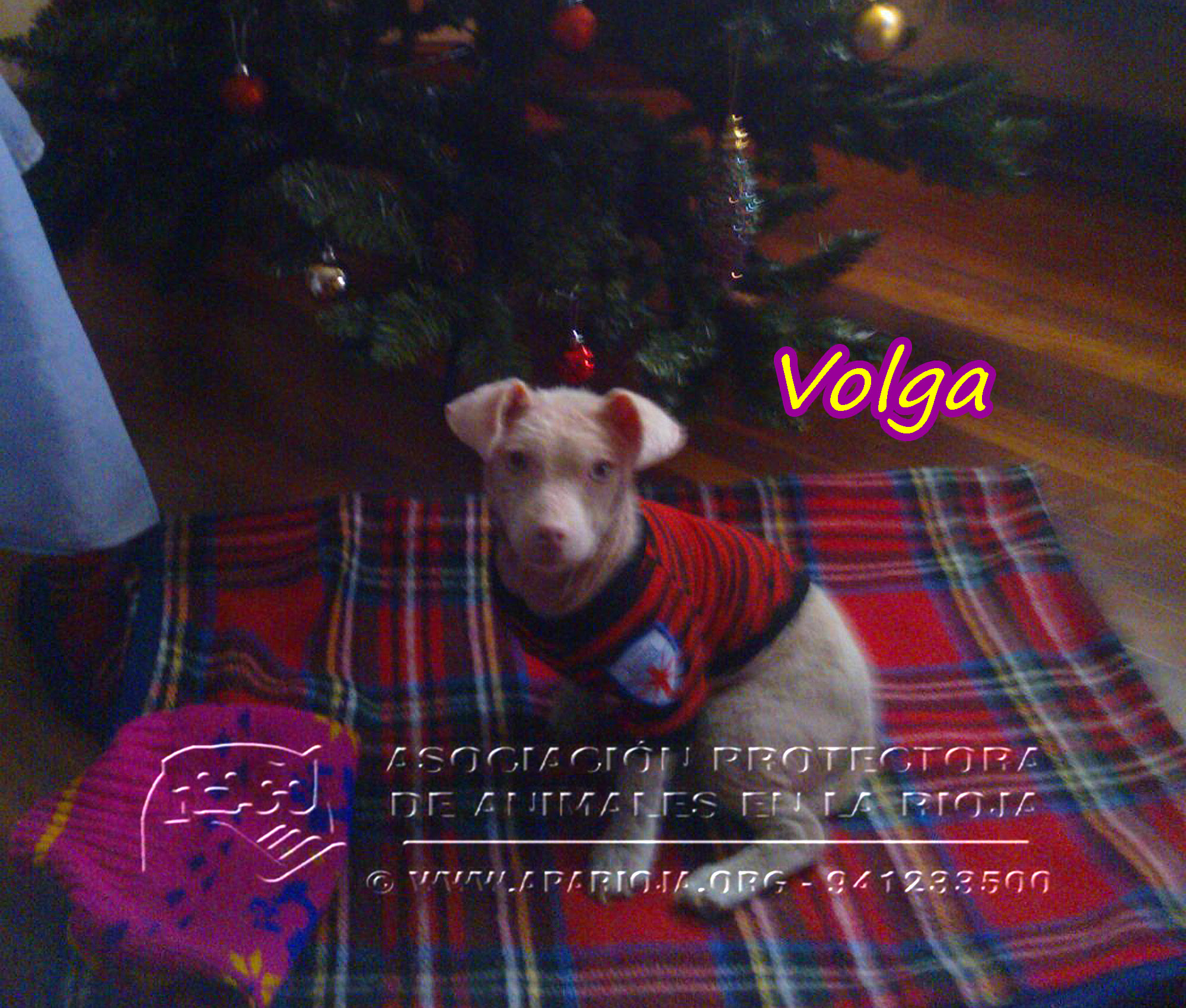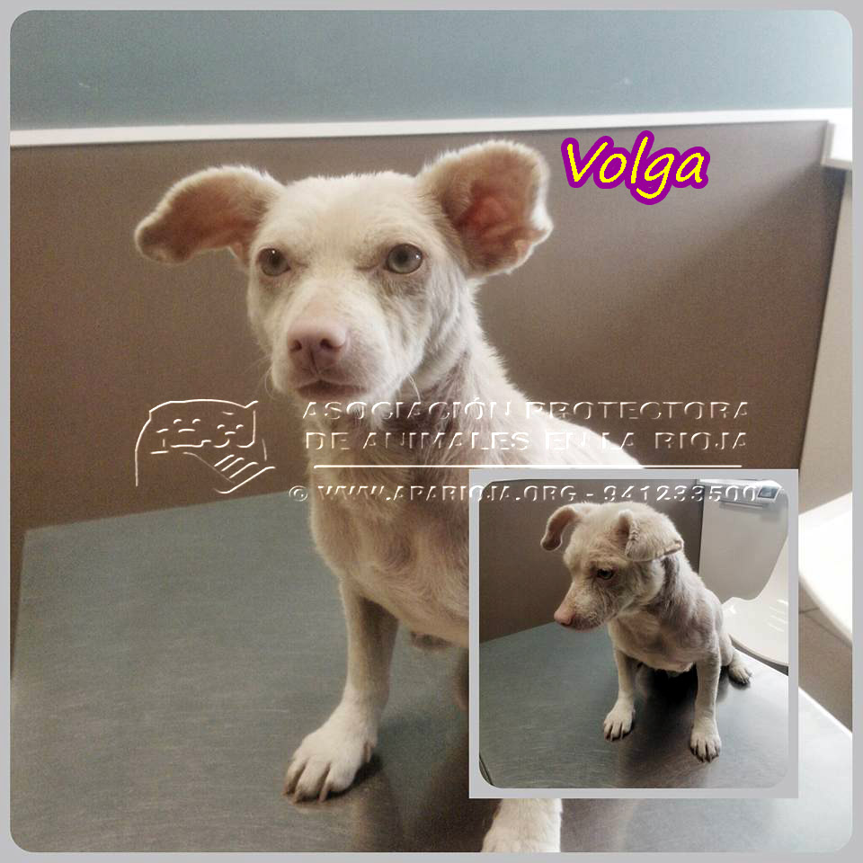 Volga es una de las perritas con sarna recogidas en el monte el Corvo el pasado verano. Su aspecto en esos momentos era impactante, entre otras cosas no tenía pelo y su piel debido a la enfermedad, estaba acartonada.