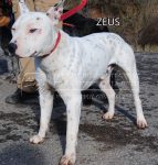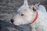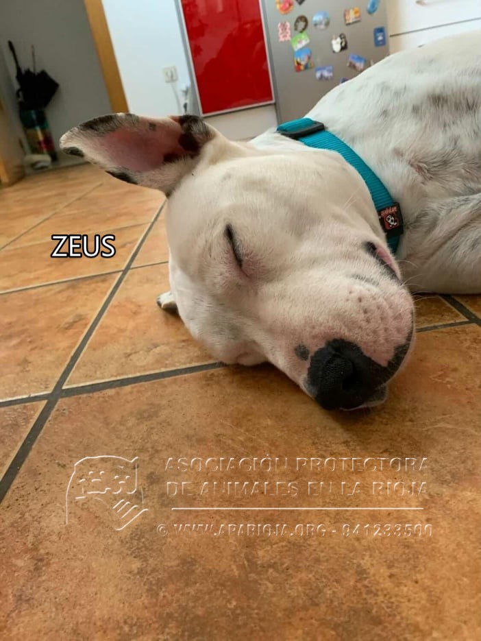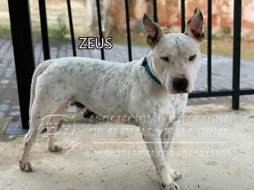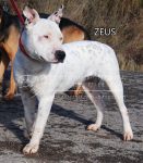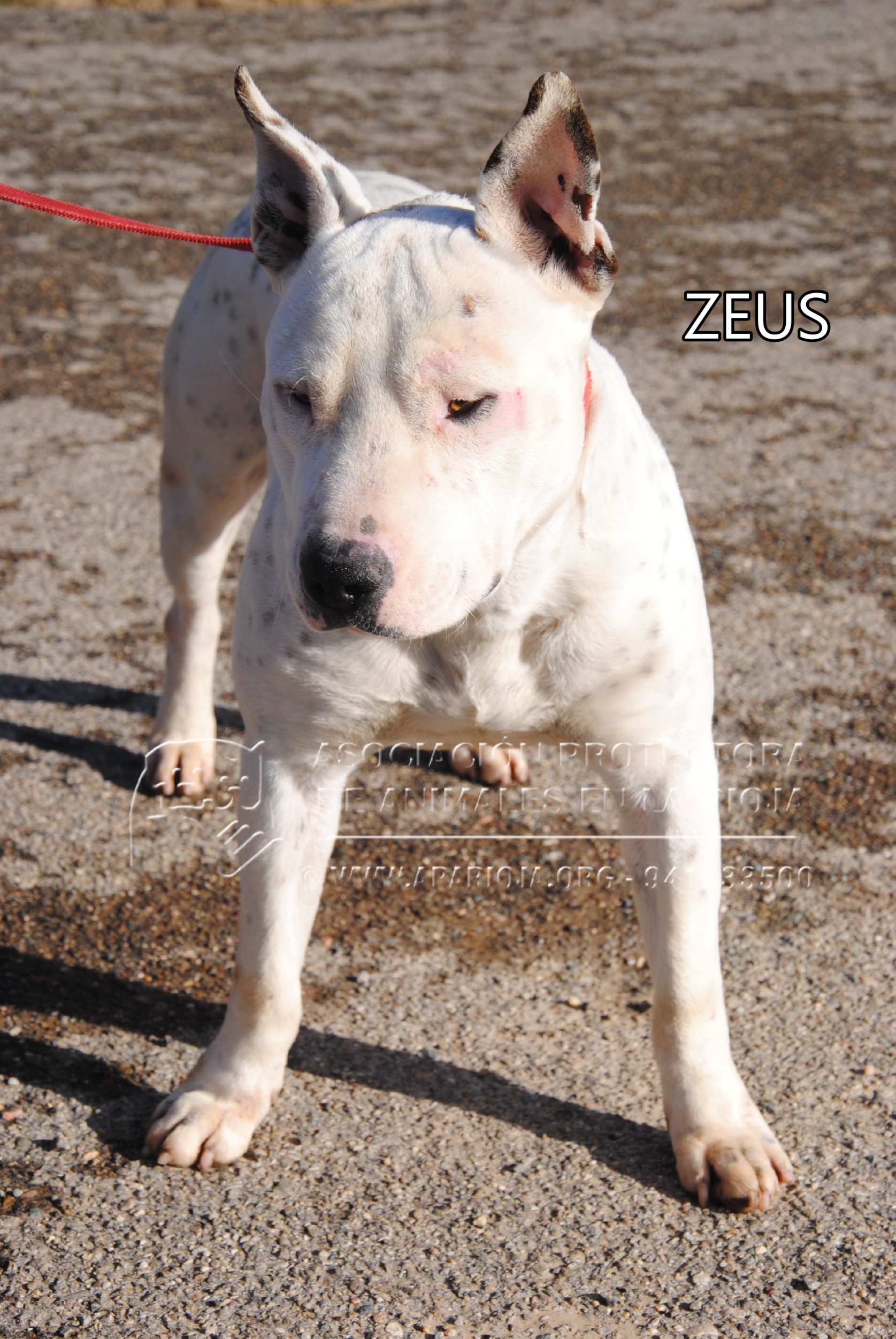 Zeus es un American Stanford cariñoso y tranquilo. Lo estamos probando con otros perros y de momento no ha habido ningún problema. Es un perro joven, nacido aproximadamente en julio de 2019.
