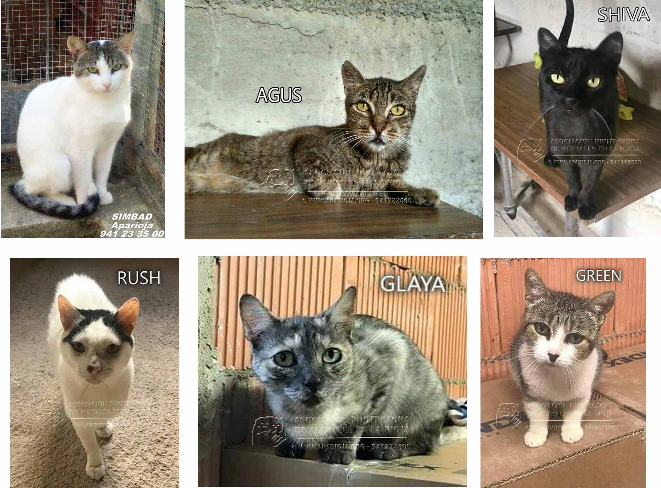 Estos son seis de sus gatos, acostumbrados a vivir en un piso, sociables, cariñosos, deseosos de ser mimados. Son tres machos, SIMBAD, RUSH Y AGUS y tres hembras, GREEN (ADOPTADA en enero de 2018), SHIVA Y GLAYA. Aproximadamente nacidos entre julio de 2015 y enero de 2016.