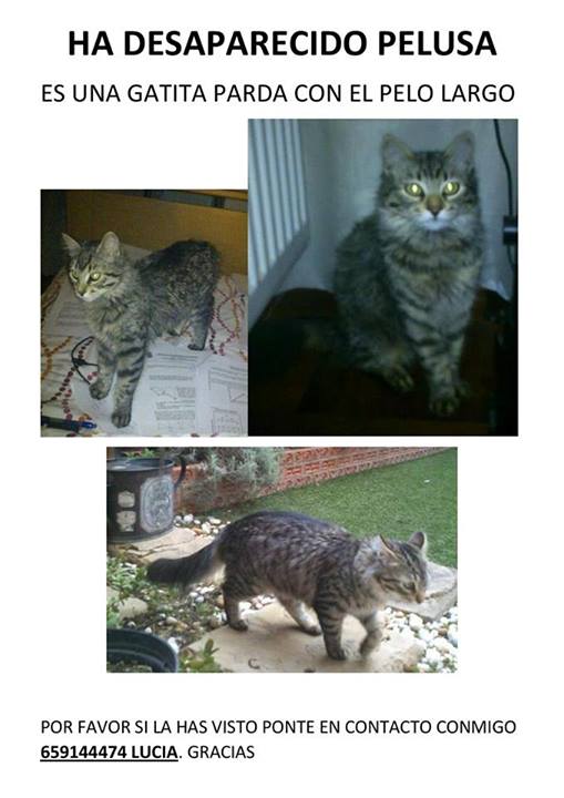 GATA PERDIDA ZONA LAS GAUNAS 23/04/2014 GATA PERDIDA ZONA LAS GAUNAS Ficha Opinions Observaciones : PERDIDA GATA ZONA LAS GAUNAS, LOGROÑO. APARIOJA 679064646 Pelaje : Largo Sexo : Hembra Tamaño Aprox. : Pequeño No opinion has been posted on this product