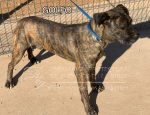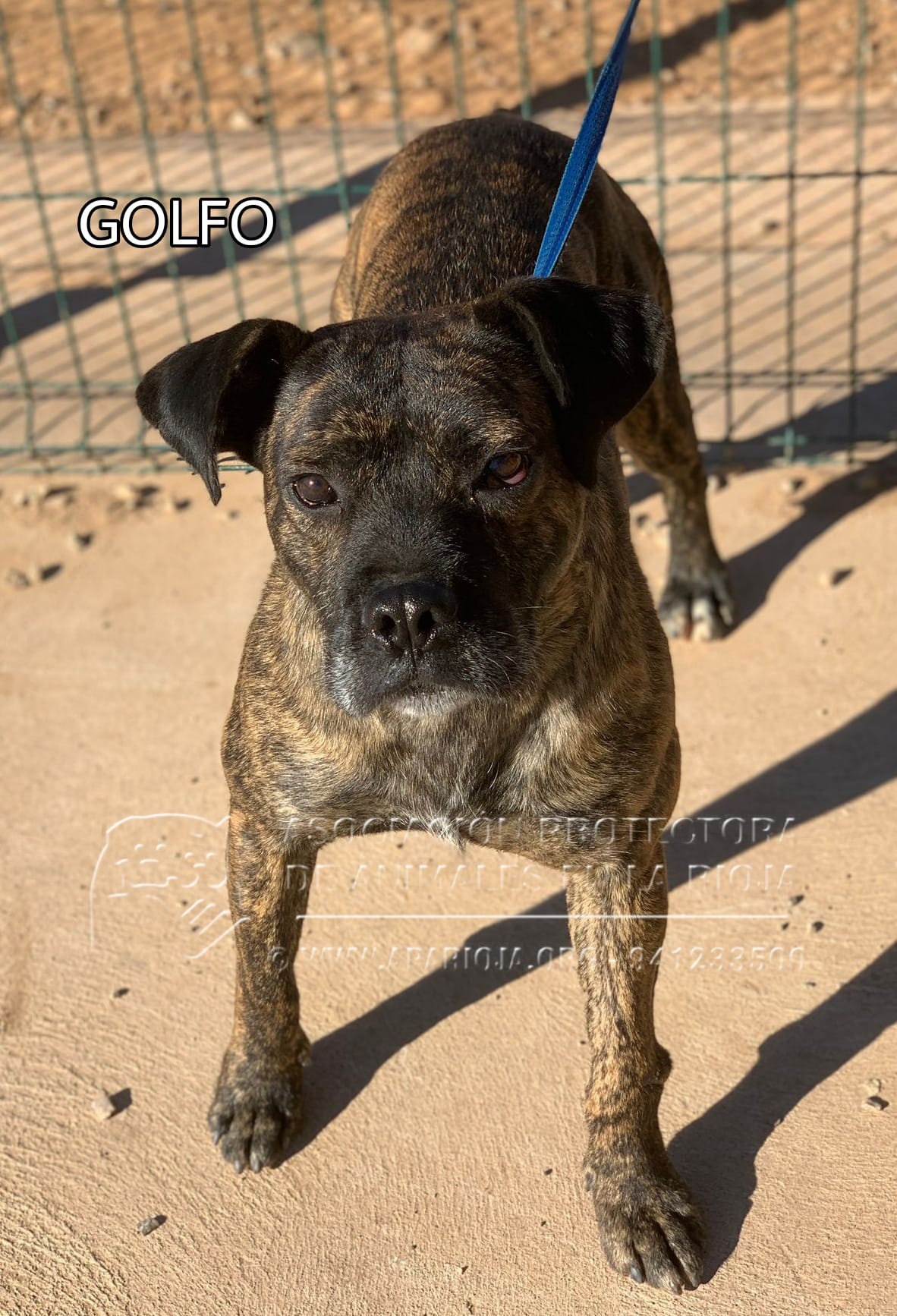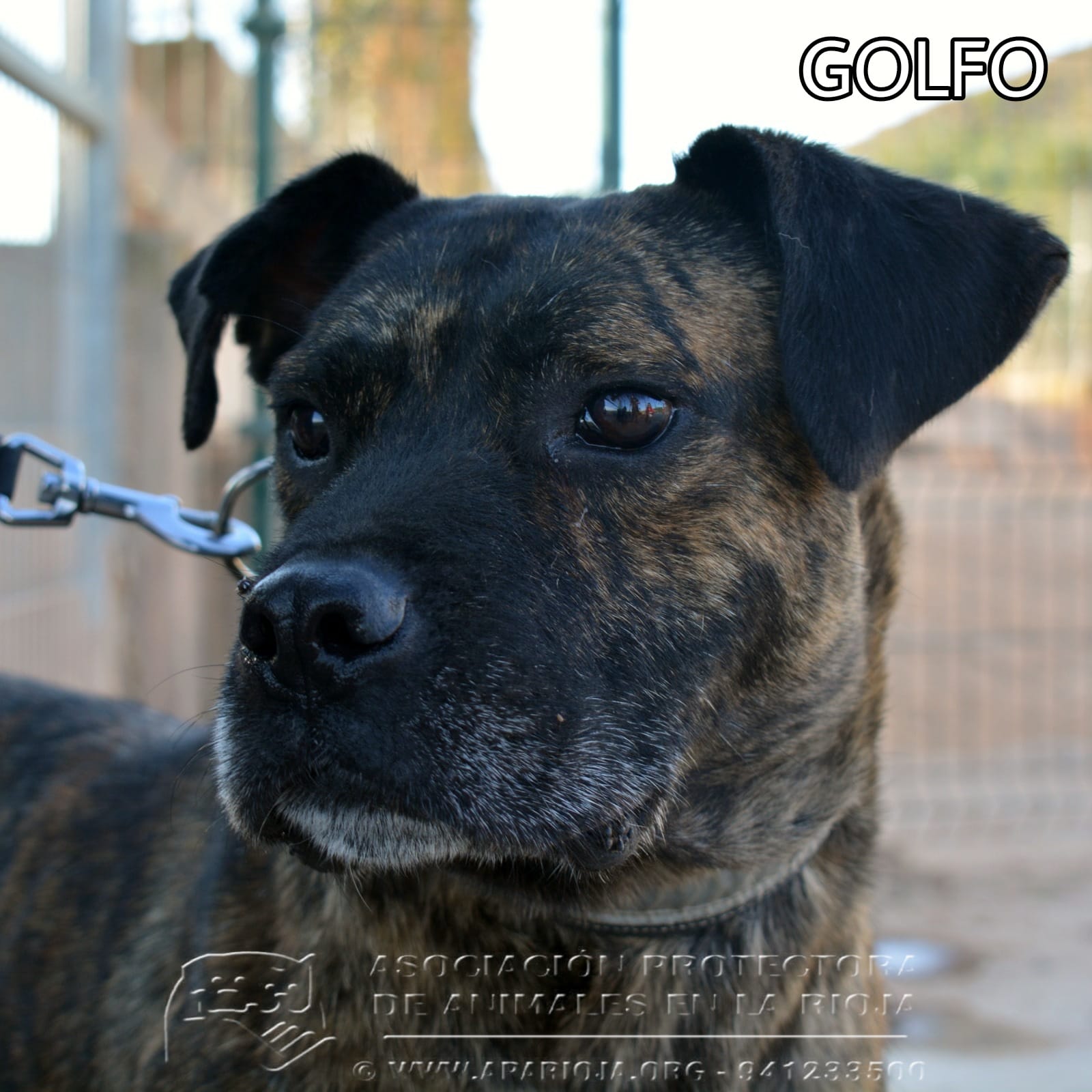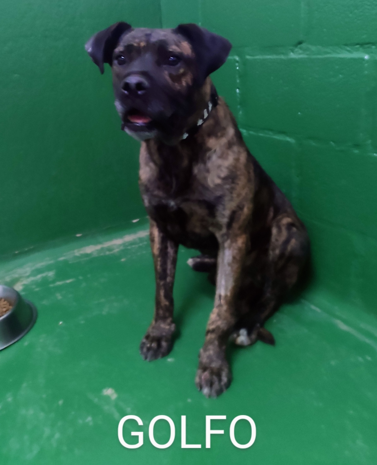 Golfo es un perro atigrado, de tamaño mediano, miedoso con humanos y muy sociable con otros perros, que llevaba desde septiembre de 2020 en la perrera.