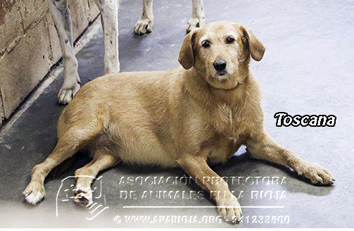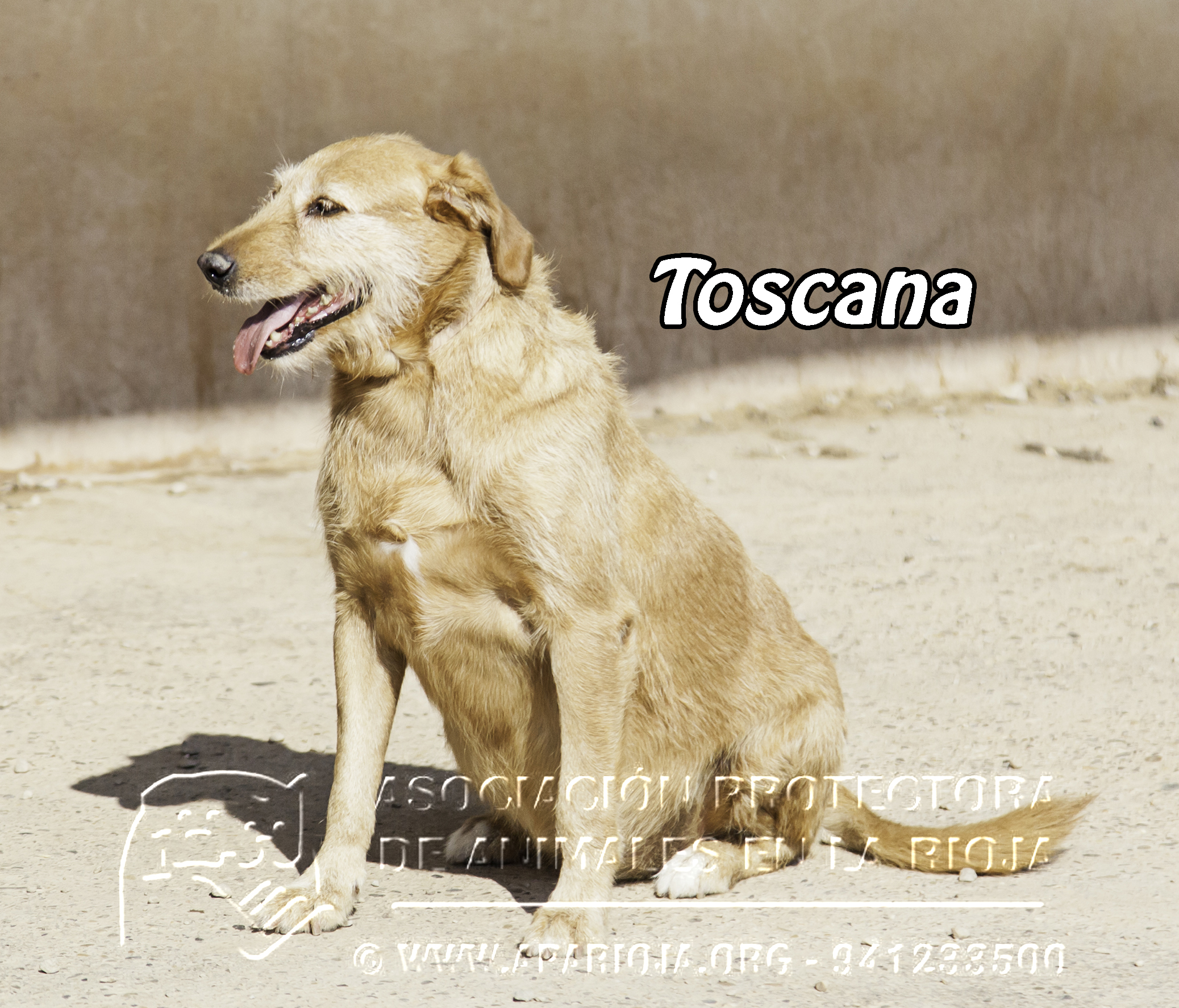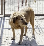 Toscana pertenece a una manada junto a BETÚN, GYLDA, TULA, KRISTA, DAMA y NERJA. Todos fueron rescatados de una finca en Villamediana, donde vivían rodeados de porquería y fueron duramente maltratados.