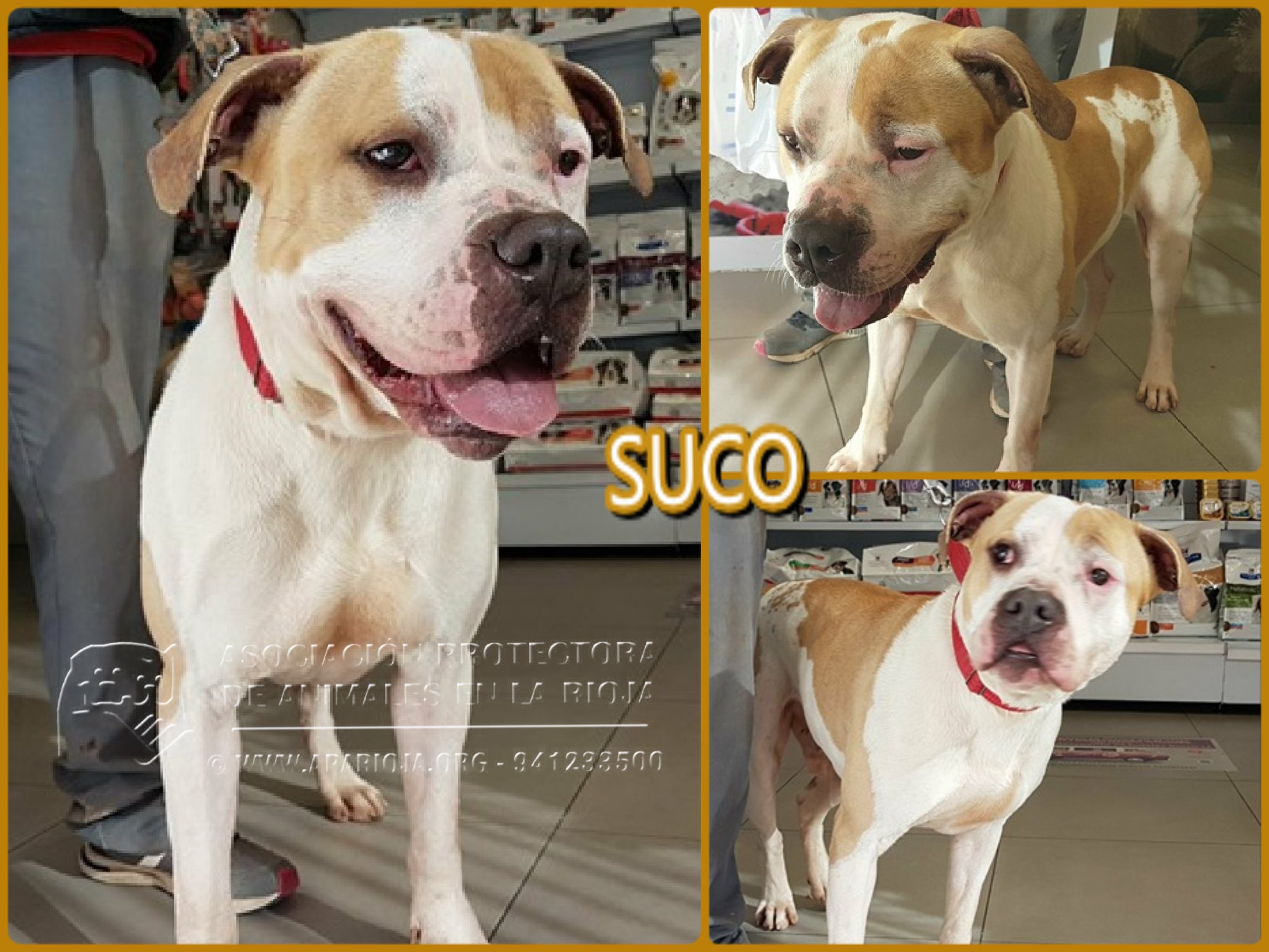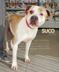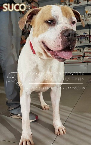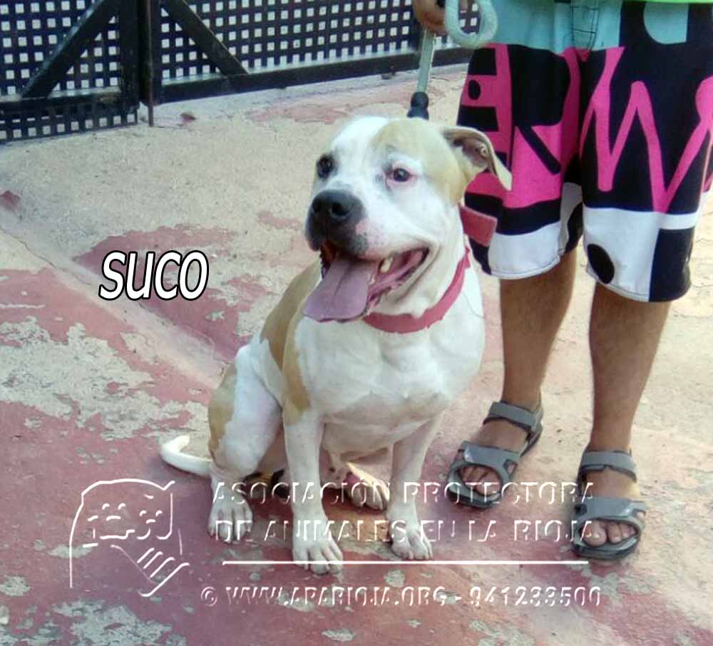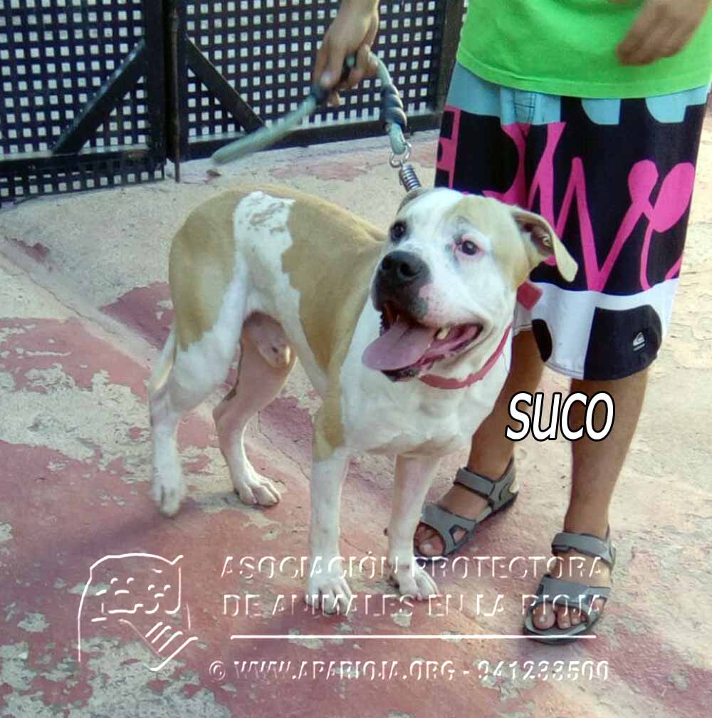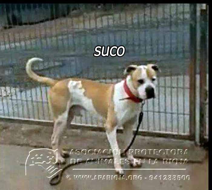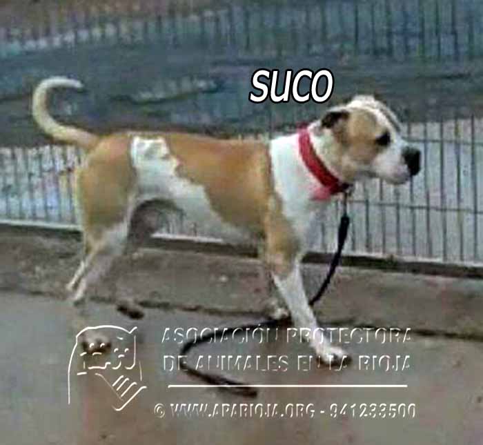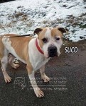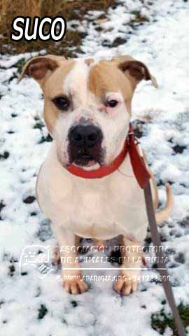 A Suco lo sacamos de la perrera el 21/08/2017 y ha estado en una guarderia pagada por una voluntaria. En noviembre de 2017 entró en nuestro refugio y está esperando una familia que lo quiera. Es un mestizo de American Standford, muy activo, que necesita largos paseos.