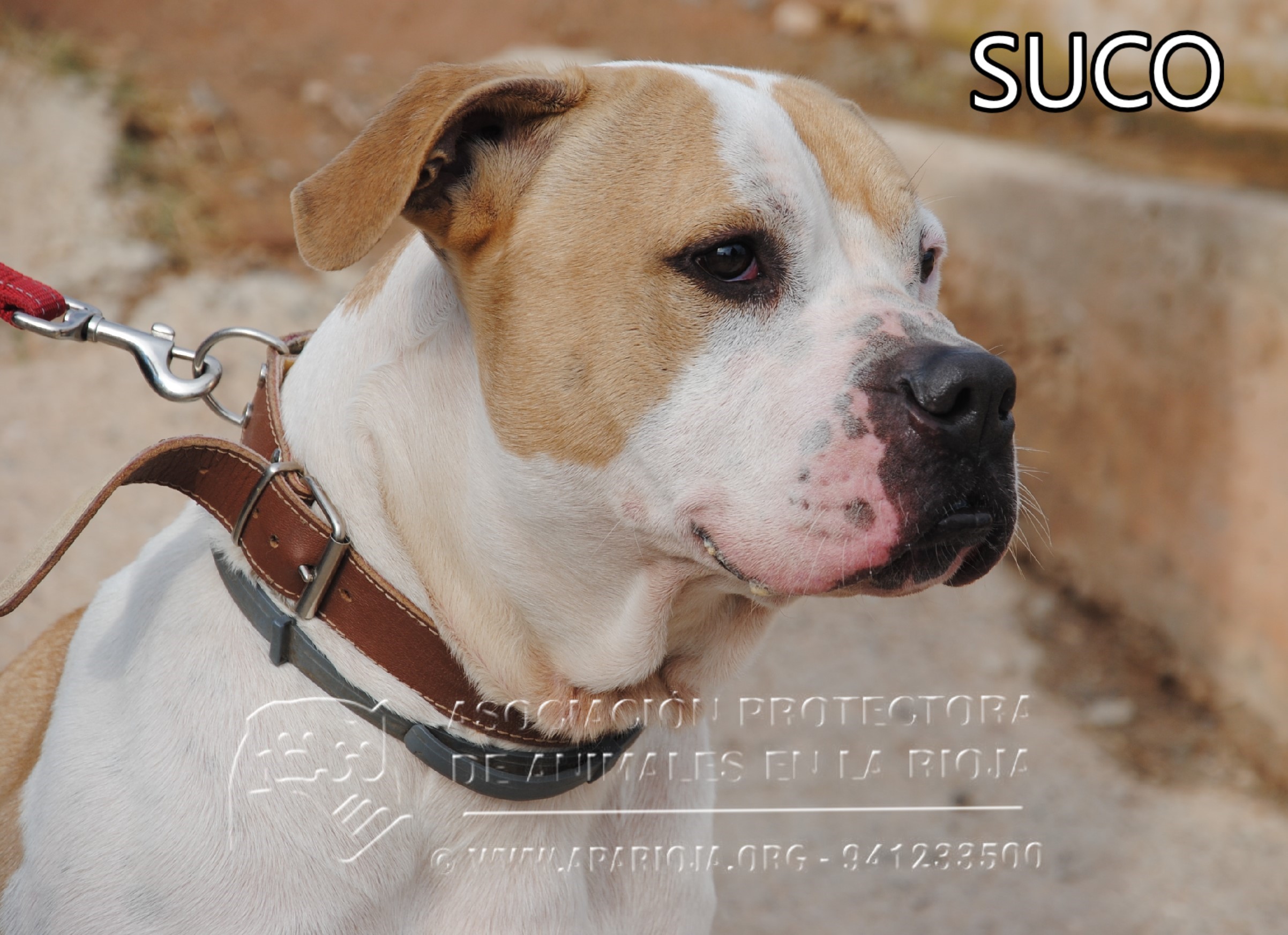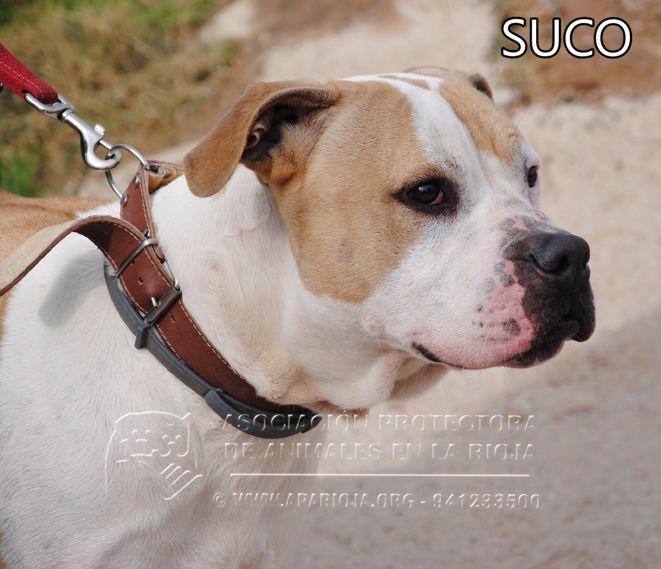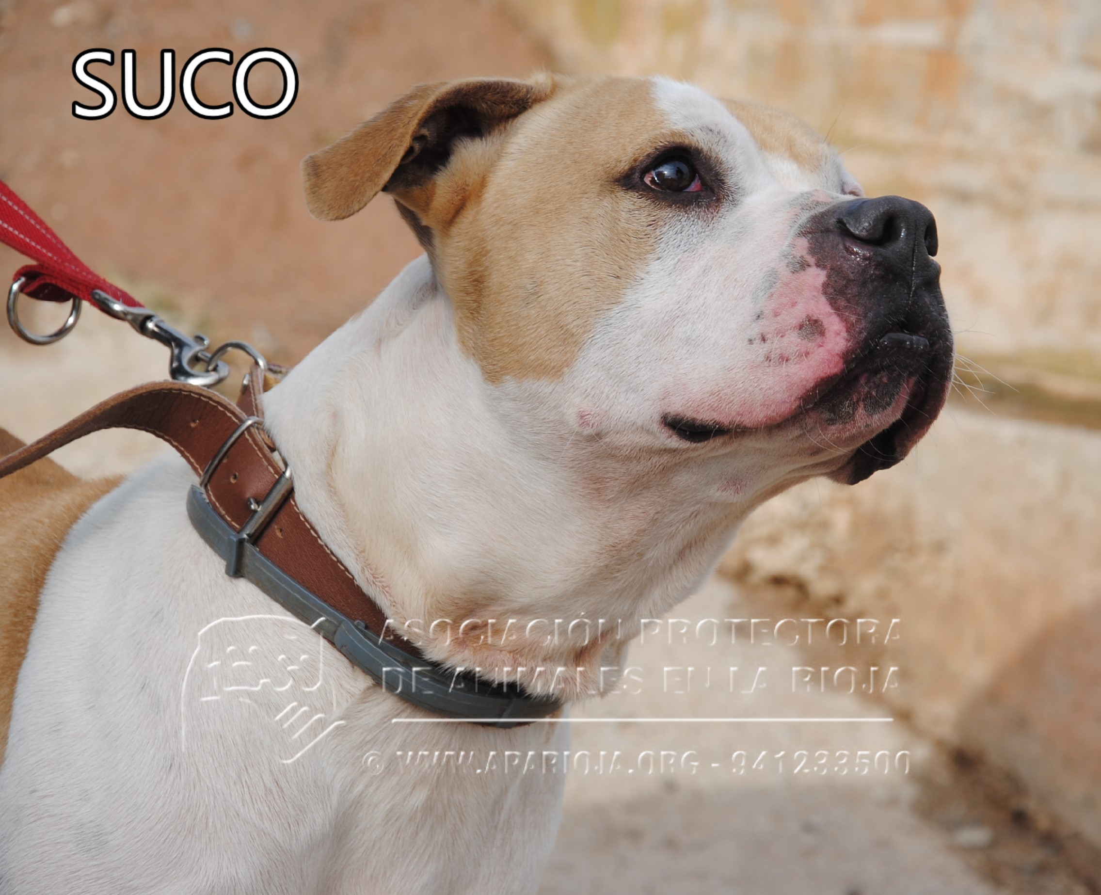 A Suco lo sacamos de la perrera el 21/08/2017 y ha estado en una guarderia pagada por una voluntaria. En noviembre de 2017 entró en nuestro refugio y está esperando una familia que lo quiera. Es un mestizo de American Standford, muy activo, que necesita largos paseos.