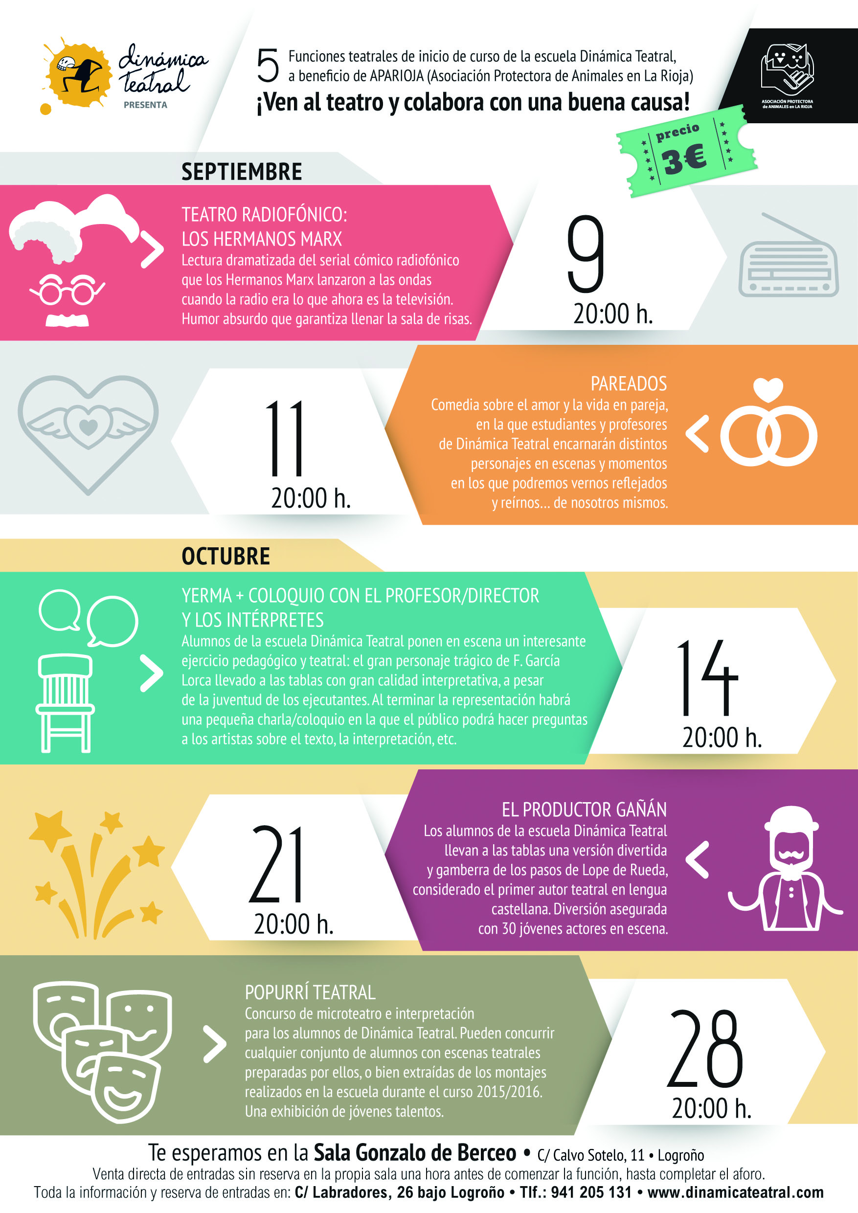 Para empezar el curso lleno de teatro han programado cinco veladas teatrales en la Sala Gonzalo de Berceo: dos en septiembre (este viernes 9 y el domingo 11) y tres más en octubre (los viernes 14, 21 y 28).