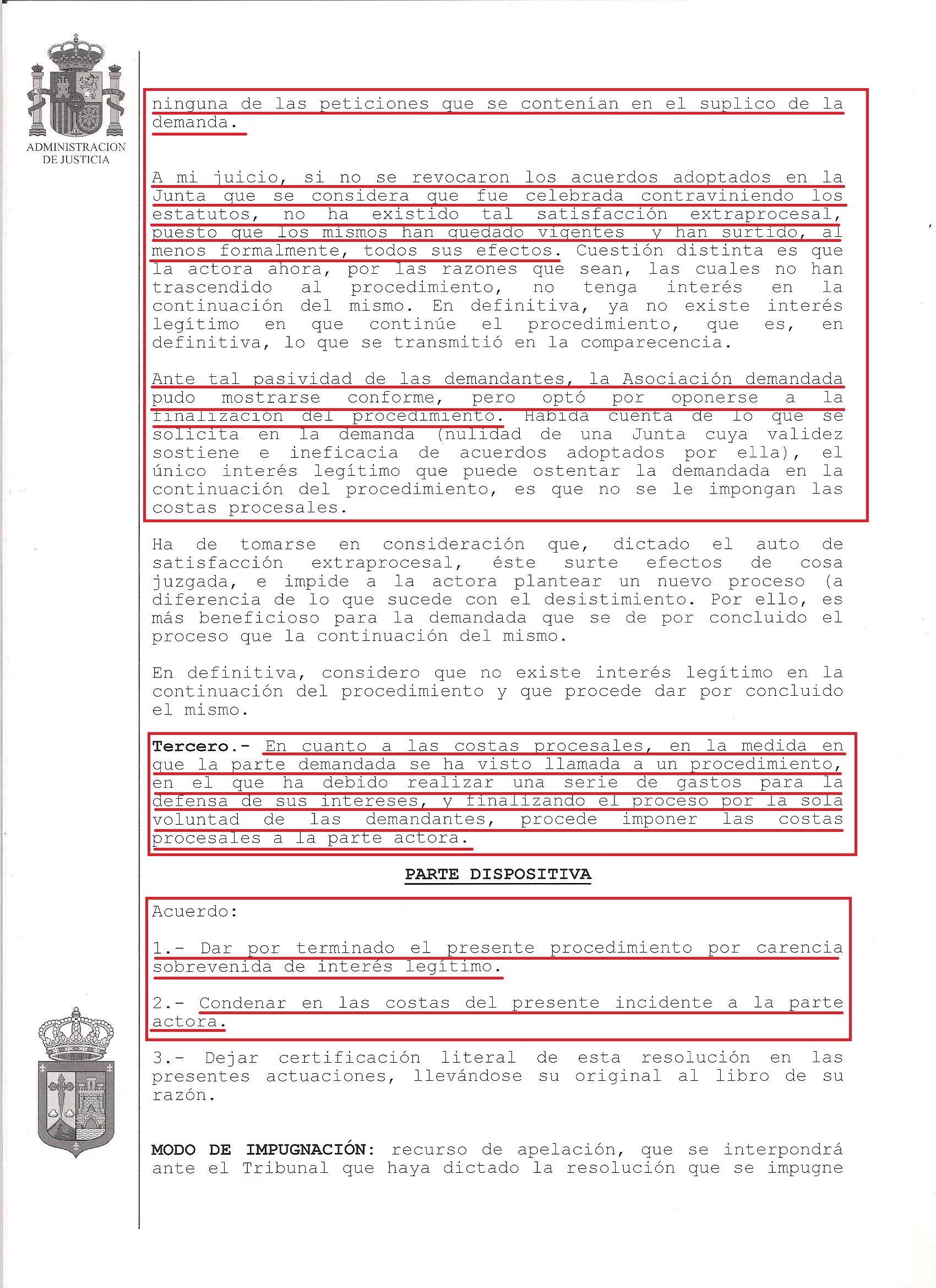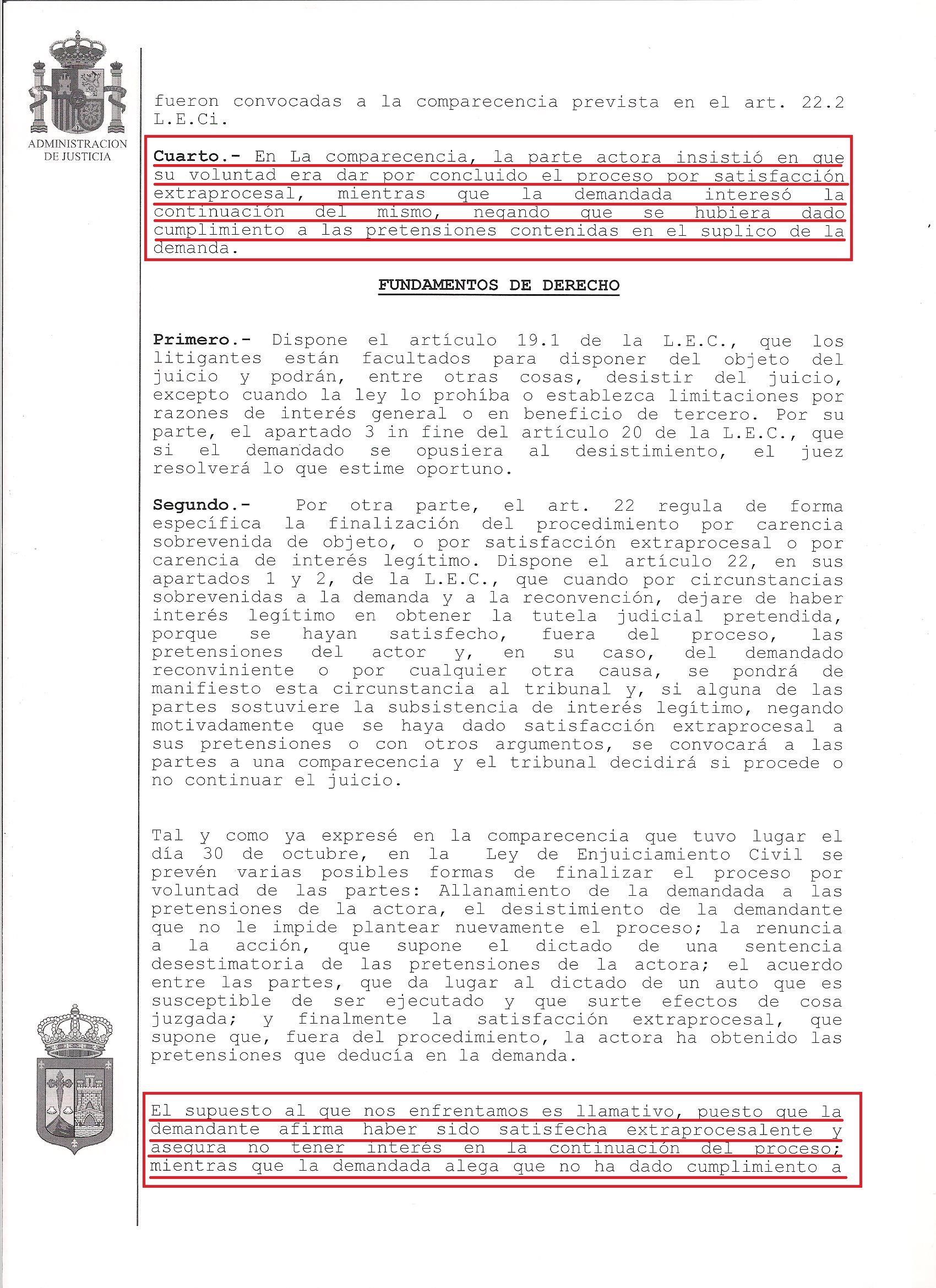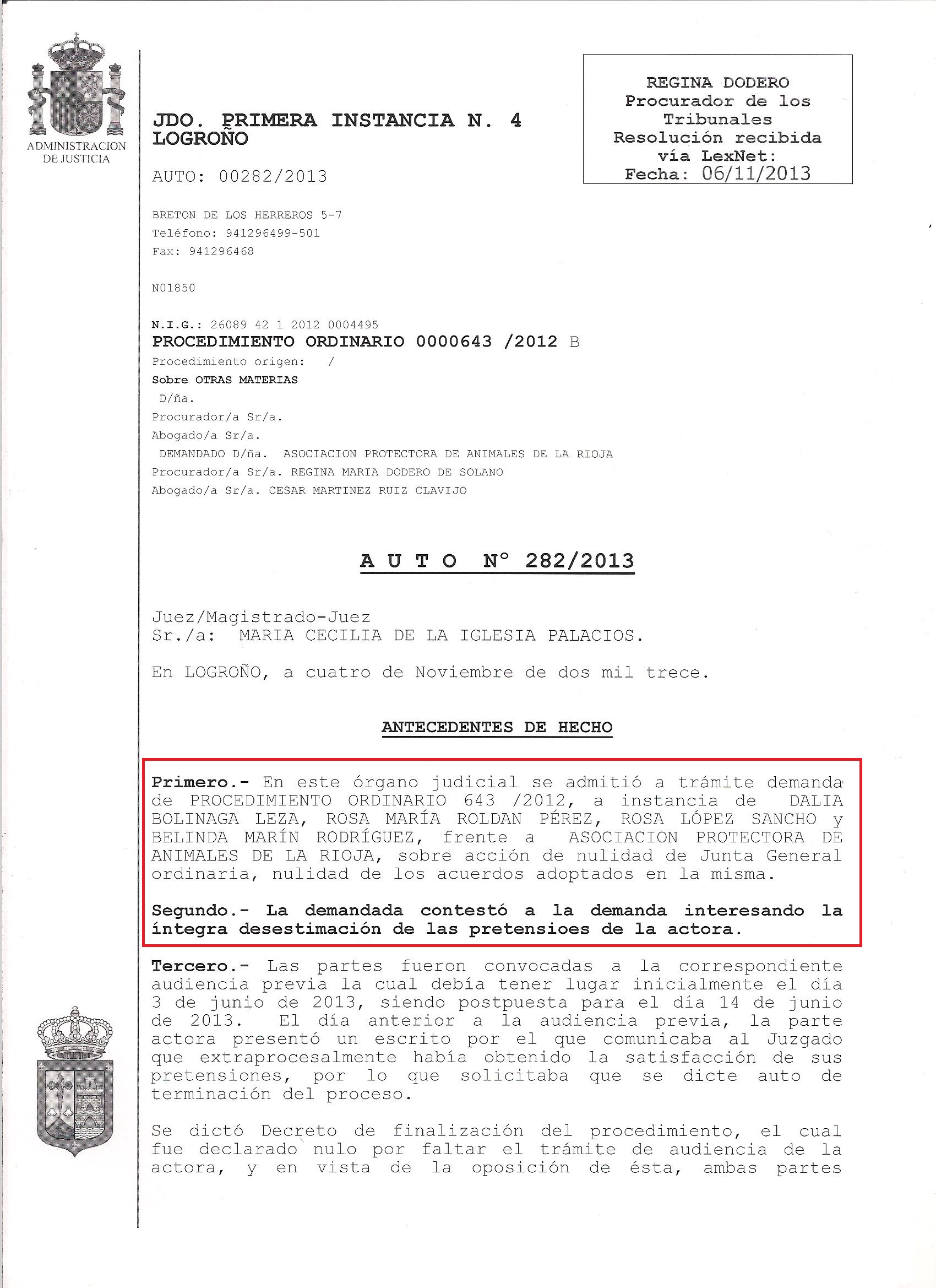 Posteriormente, en fecha 04 de Noviembre de 2013, la Juez emite el AUTO Nº 282/2013, con el veredicto relacionado al PROCEMIENTO ORDINARIO 0000643/2012 B, donde la Juez decide: