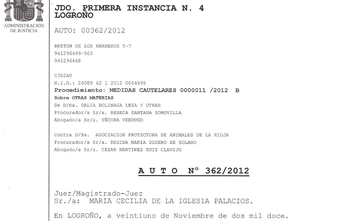 El 27 de Mayo de 2012, las socias ROSA ROLDAN PÉREZ, DALIA BOLINAGA LEZA, BELINDA MARÍN RODRÍGUEZ, Y la EX-SOCIA ROSA LÓPEZ SANCHO, formulan demanda frente a Asociación Protectora de Animales en La Rioja, sobre acción de nulidad de Junta General ordinaria, nulidad de los acuerdos adoptados en la misma. En dicha fecha: presentan medidas cautelares contra la Asociación, solicitan inscribir sentencia en el Registro Mercantil de La Rioja, su publicación en Boletín Oficial y anotación preventiva de esta demanda en registros públicos.